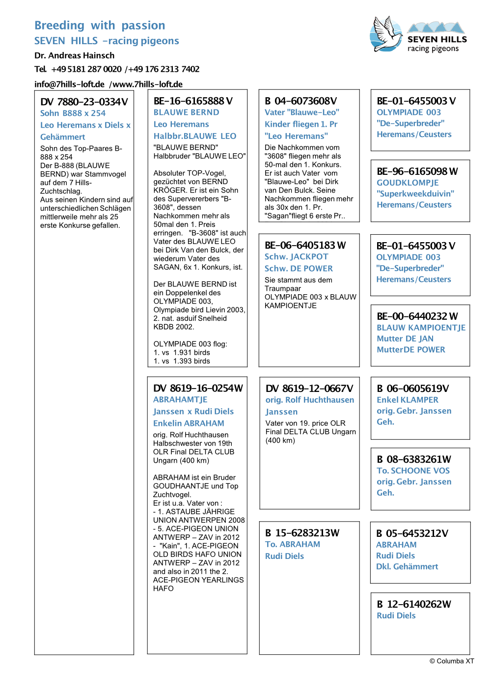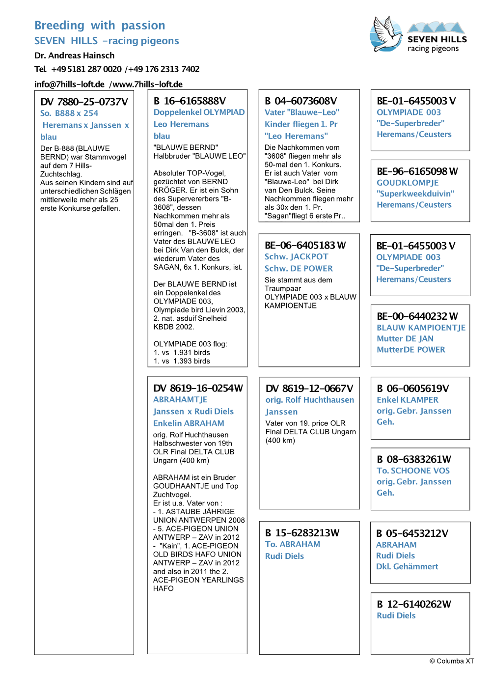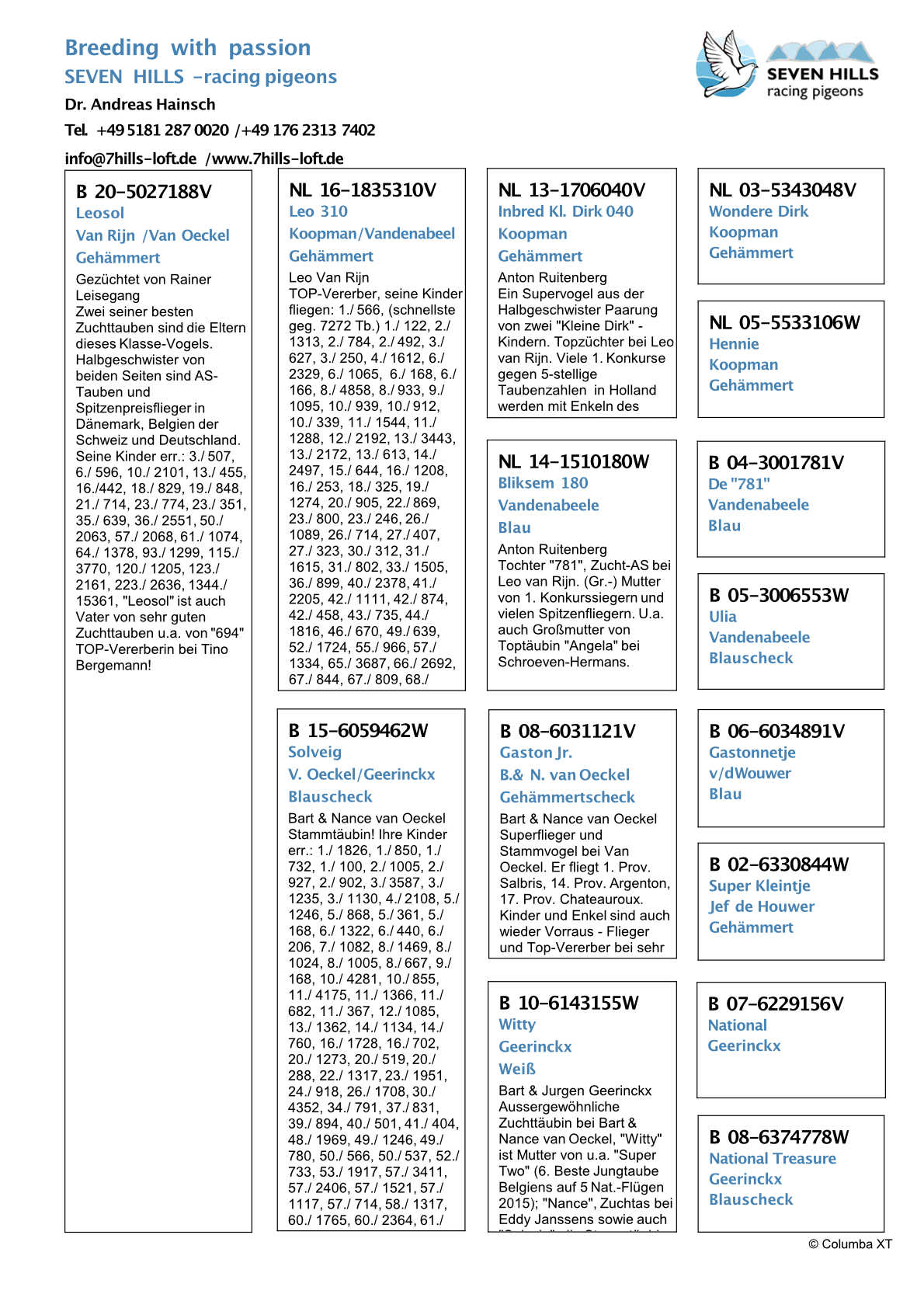 Er ist ein Originaler Jos Cools, dessen alte fahle Linie mit an der Basis des GOEDE RODE und BROER GOEDE RODE steht. Jos Cools ist eine Top-Adresse in Belgien und war u.a. 1. nat. Meister KBDB Kurzstrecke 2015.