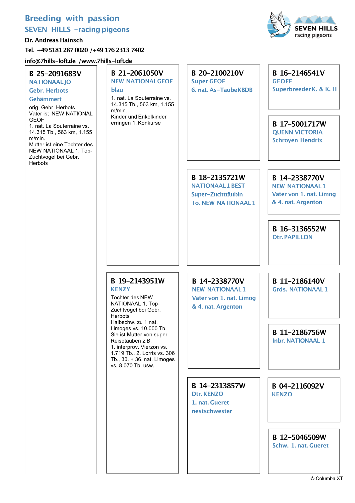 Seine Mutter ist eine Tochter des NEW NATIONAAL 1, Top-Zuchtvogel bei den Gebr. Herbots.